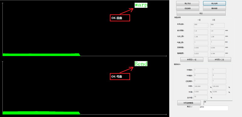 通過位置的信息可以得到PCB板的板厚曲線圖,通過特定軟件算法和翹曲度定義,計(jì)算出板翹曲度,并根據(jù)設(shè)定判斷條件得出OK和NG板。